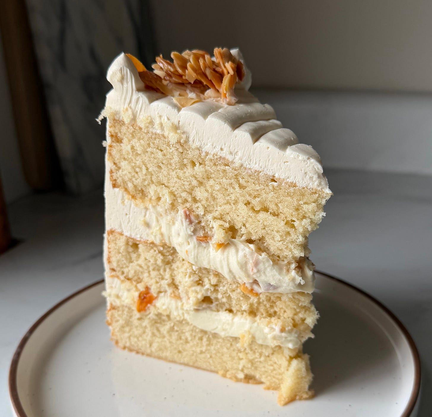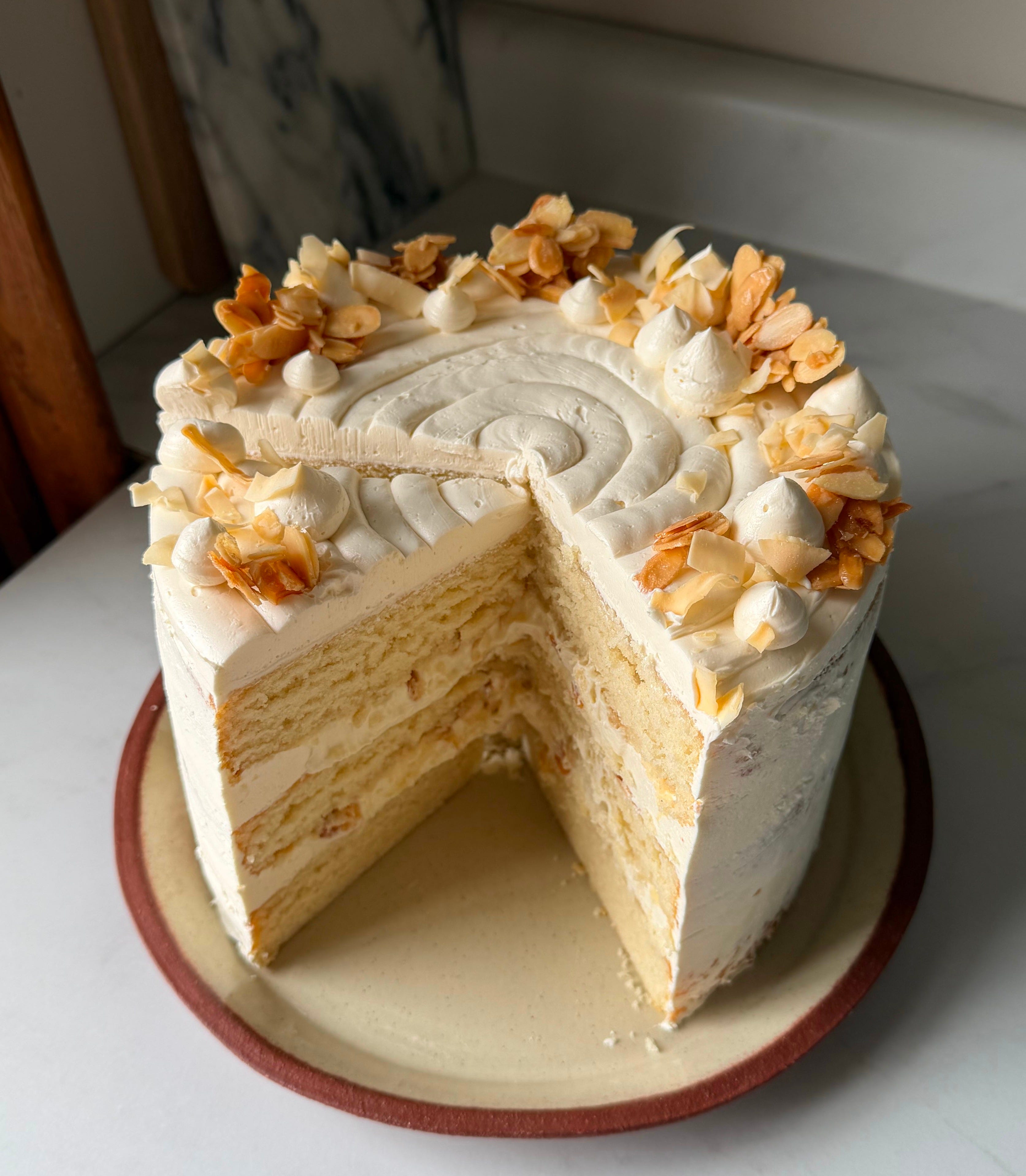 almond buttermilk cake, coconut ganache, candied almonds + toasted milk italian buttercream