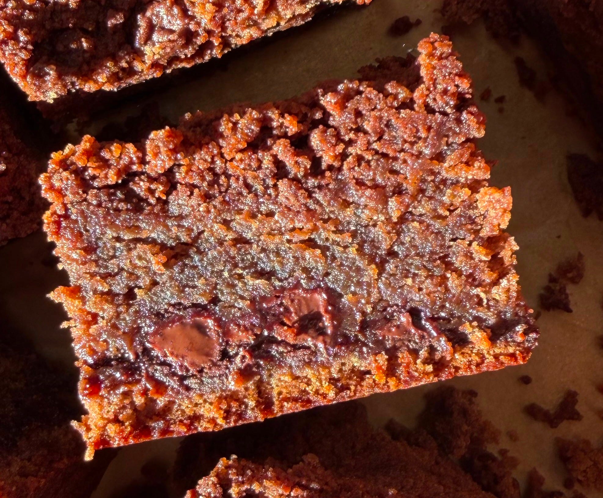 Preheat your oven: to 350F degrees. Line a 10×10 inch square baking dish with parchment paper and spray with nonstick spray. (Can maybe get away with a 9x9 but 8x8 is too small! The bottom will burn before the cake is cooked through)